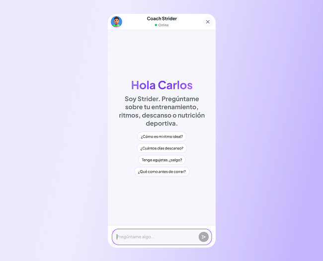 Ve que el martes saliste con intención de hacer 10 km y volviste a los 6. Ve que llevas tres semanas seguidas corriendo más de lo planificado. Ve que tu ritmo de rodaje fácil no es tan fácil. Con ese contexto real, el coach tiene algo con lo que trabajar.